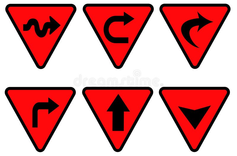 What are the colors of the warning signs that indicate hazards ahead such as curves in the road or narrow bridges. The three-sided red yield signs mean you must slow down and be ready to stop to let any vehicle bicyclist or pedestrian pass before you proceed. A red and white triangular sign at an intersection means Definition.